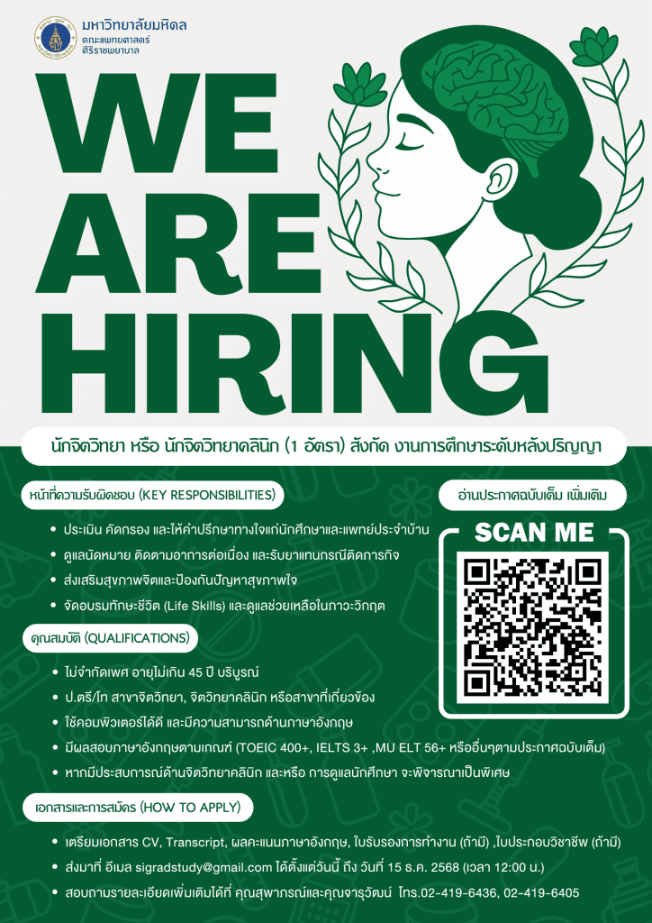 งานการศึกษาระดับหลังปริญญา คณะแพทยศาสตร์ศิริราชพยาบาล กำลังมองหาบุคลากรคนรุ่นใหม่ไฟแรง